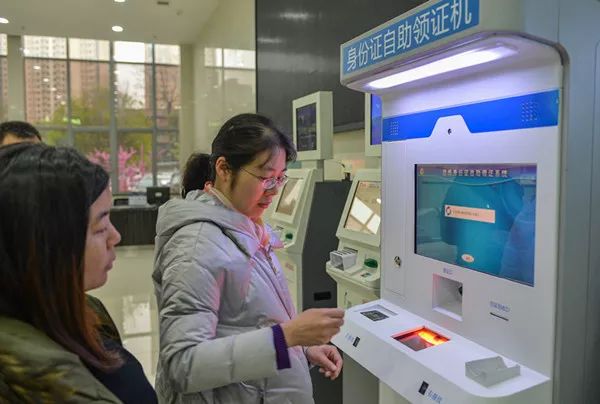 在身份证制作所旁边的长沙市公安局人口与出入境接待大厅,居民通过自助领证机领取身份证。 长沙晚报记者 邹麟 摄